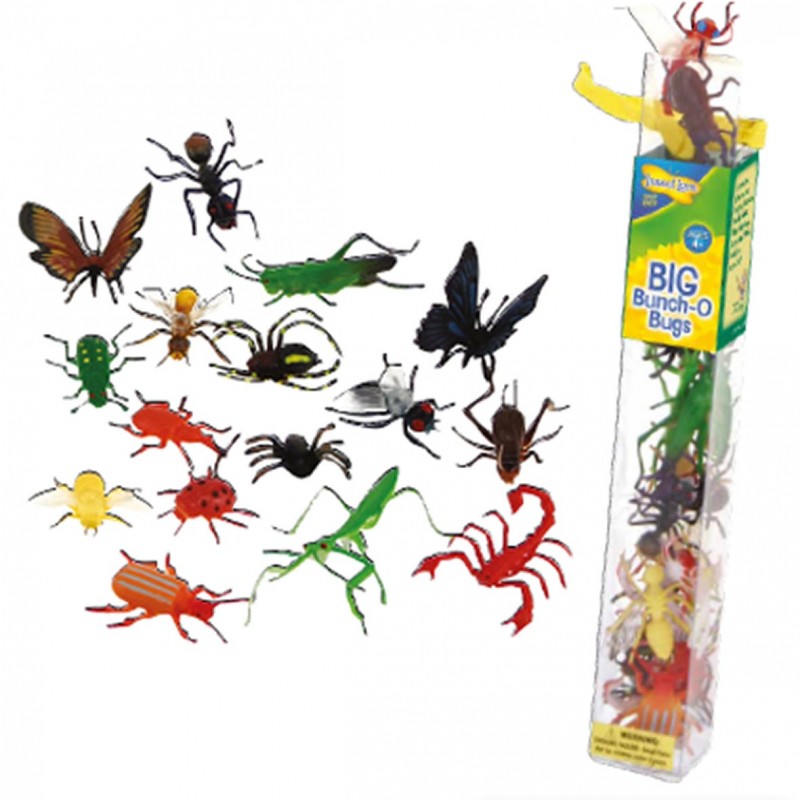 Un lot de 18 figurines en plastique souple pour illustrer les différences entre divers arthropodes terrestres (araignées, scorpion, papillons, mante, abeille, sauterelle, mouche, libellule, coccinelle, lucane, grillon, fourmi...).