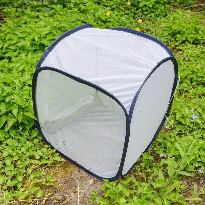 Cages d'élevage en tulle blanc, complètement pliables et très légères, montées sur armature métallique flexible.